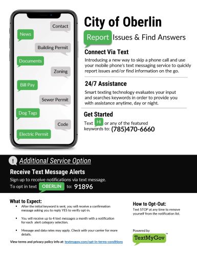 Sign up to receive text message alerts from the City of Oberlin, text “OBERLIN” to the number 91896. This allows the city to message our residents and notify them of outages, upcoming projects, etc. For details, click here to see the informational flyer.
